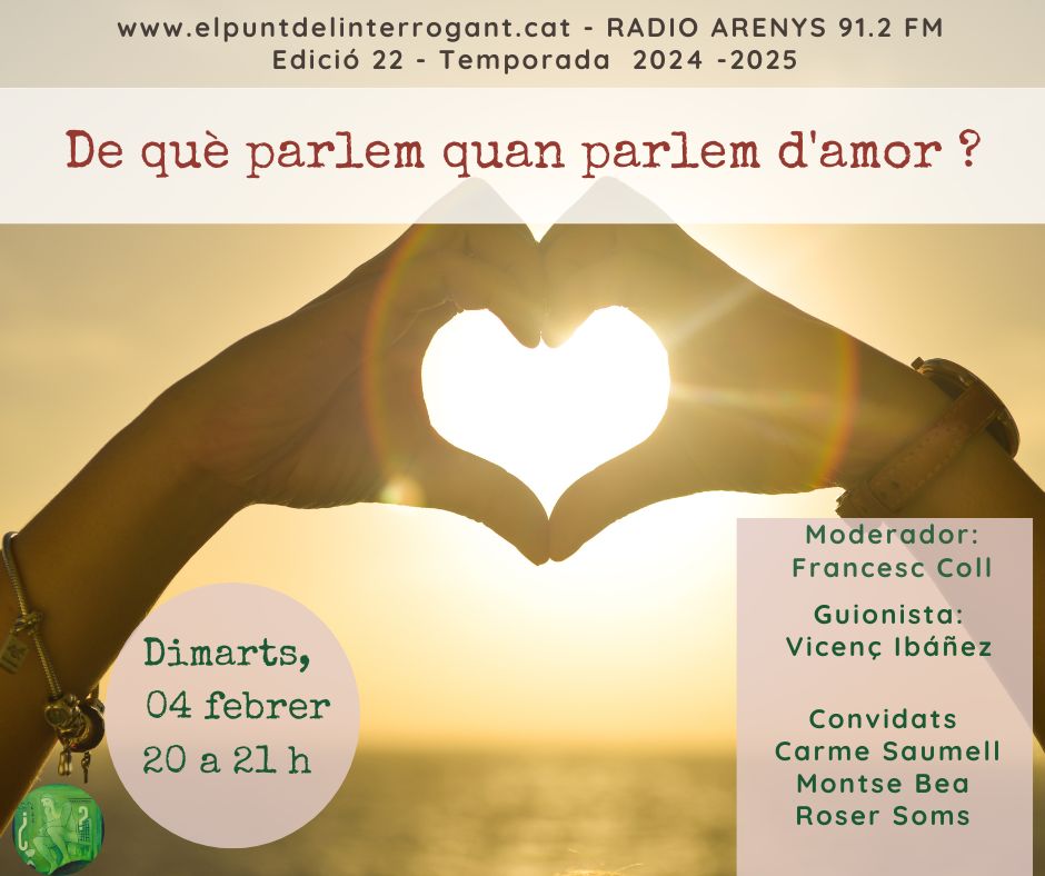 L’interrogant d’avui no té la intenció de definir què és l’amor —si és que això resulta realment possible—, sinó reflexionar sobre les dificultats que tenim per a viure l’amor tal qual, sense interferències. Parlem d’amor a tort i a dret, però sabem certament de què parlem quan parlem d’amor?